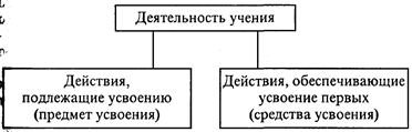 Главное лицо в учебном процессе - ученик. Усилия учителя направлены на то, чтобы он учился. Для этого необходимо, чтобы ученик хотел учиться и мог это делать. Часто ребенок идет в школу с большим желанием учиться, но без умения это делать. Если не научить ребенка учиться, то с первых же шагов школьной жизни он встретится с трудностями, неудачами, которые постепенно угасят и его желание учиться. Из чего же состоит это умение? Оно включает в себя действия всех трех видов, которые были рассмотрены нами выше. Эти действия вначале входят в деятельность учения как предмет усвоения, их ученик должен усвоить. После усвоения их, когда они уже войдут в состав познавательной деятельности учащегося, эти действия могут использоваться как средства усвоения новых действий, войти в состав умения учиться. Таким образом, в деятельности учения одно и то же действие может занимать разное место: вначале быть предметом усвоения, а потом - его средством. И каждый раз, когда ученик усваивает новые действия, он должен располагать средствами их усвоения - уметь усвоить. Другими словами, деятельность учения состоит из двух составляющих: ученик должен выполнить усваиваемое действие и действия, которые обеспечивают усвоение первого с заданными свойствами. Так, при освоении счета ребенок должен перейти от реальной палочки, лежащей перед ним, к слову «один». Между этими двумя объектами внешне нет никакого сходства, но они заменяют друг друга, и ребенок должен уметь перекодировать действие из одной нормы в другую. Вся совокупность действий, необходимых для успешного усвоения новых, и составляет умение учиться этим новым действиям. Это и есть вторая составляющая деятельности учения. Графически это можно изобразить так: