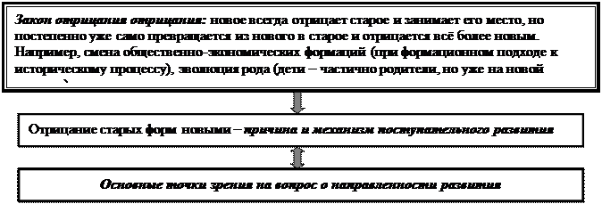 азвитие - это поступательное движение к новому качеству, которое предстает как результат взаимосвязанных переходов от старого к новому. Без отрицания старого возникновение и созревание нового невозможно. При этом отрицание старого не означает его полного уничтожения. Оно представляет собой связь нового и старого. Отмирает и исчезает отжившее. Содержание, которое необходимо и способно к дальнейшему совершенствованию и развитию, ничего существенного не утрачивает, оно «снимается» новым качеством, переходит в свою противоположность. Такое отрицание называется диалектическим отрицанием, выражающим противоречивую природу поступательности и преемственности в процессе развития, характеризующее возникновение нового и относительную повторяемость, необходимость моментов старого. Таким образом, исходное состояние в силу противоречивой природы развития превращается в свою противоположность, свое отрицание, что, в свою очередь, неизбежно подлежит превращению уже этой противоположности в свою противоположность, происходит отрицание отрицания. Развитие как бы повторяет пройденные стадии, но на новой, более высокой ступени. Весь процесс развития предстает как определенная последовательность циклов и образно выглядит в виде расширяющейся спирали, указывающей общее направление, тенденцию развития. Итак, если закон единства и борьбы противоположностей раскрывает причину, источник развития, объясняет, почему есть движение, развитие, а закон перехода количественных изменений в качественные характеризует процесс развития, объясняет, каков характер этого процесса и как он совершается, то действие закона отрицания отрицания обнаруживает направление и итог, результат развития — в каком направлении и к чему ведет развитие.