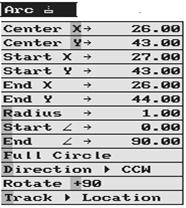 Start X - x – значение отметки начала Line. Start Y – y – значение отметки начала Line. End X – x – значение конечной отметки Line. End Y – y – значение конечной отметки Line. Length – общая длина Line. Angle – угол, на который Line выводится. Редактирование линии осуществляют также с помощью команды Line. При редактировании конечные точки линии высвечиваются красными прямоугольниками, а появившееся меню комплекта инструментальных средств Line отразит текущие свойства линии (координаты x и у, длину и т.д.). Чтобы изменить длину или угол наклона линии, необходимо щелкнуть мышью по одной из высвеченных конечных точек и затем переместить ее в новое положение. Для изменения положения линии на экране указатель мыши устанавливают посередине линии и перетаскивают ее в другое место. Для изменения цвета линии сначала выбирают в цветовой палитре (Color Palette) нужный цвет, а затем щелчком мыши указывают линию. Polyline – добавление ломаной линии Опция Polyline дает возможность вывести на экран соединенные сегменты Line любой формы. Polyline имеет комплект инструментальных средств, идентичный тому, который был описан в разделе Line. Этот комплект отражает свойства только той линии, которая в настоящее время выводится как часть операции Polyline. Arc – добавление дуги При использовании Arc, комплект инструментальных средств задает следующие параметры дуги (рис. 36):