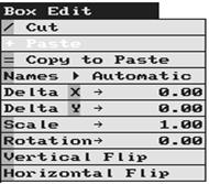 Cut - удаляет выбранные элементы, после этого они доступны для вставки. Paste - вставка вырезанных или скопированных элементов. Name - определит, как обработать именованные элементы при вставке многократных копий. Delta X - относительное смещение по оси x. Delta Y - относительное смещение по оси y. Scale – масштаб. Rotation - относительный угол вращения. Vertical Rip - инвертирует элементы “верхняя часть к нижней части“. Horizontal Flip - инвертирует элементы “слева направо”. Блок задают щелчками мыши сначала одного, а затем другого противоположного по диагонали углов. Следует обратить внимание на то, что Box Edit можно использовать для перемещения геометрических элементов в Draw Mode и Class Mode, из режима в режим, из файла в файл (изменяя файлы размещения без выхода из Proof Animation).