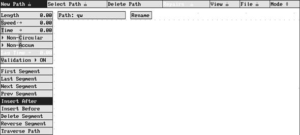 Большинство видов движения можно представить как перемещение по заданному пути. Задание движения по определенному пути - одна из наиболее важных особенностей Proof Animation. Путь задается по линиям (Lines) и дугам (Arcs) и является невидимым элементом. Path Mode (Режим пути) Proof Animation обеспечивает специальный режим определения пути, который можно выбирать из меню Mode (режим). Пути показываются в цвете. Другие элементы отображаются черным цветом на сером фоне. В большинстве случаев пути показываются синим цветом. Путь, который необходимо исправить (Repairs), показывается белым цветом. У текущего выбранного пути цвет желтый, а у выбранного сегмента пути цвет красный. Меню Path Mode имеет вид, представленный на рис. 39. Полоса меню Path Mode (режим пути) расположена в верхней части экрана. Она содержит следующие опции: New Path (новый путь), Select Path (выбрать путь), Delete Path (удалить путь), Repairs (исправить), и уже знакомые View (вид), File (файл) и опции Mode (режим). Команда Delete Path доступна только после того, как путь был задан или выбран для редактирования. Команда Repairs доступна, если изменения, сделанные в Draw Mode (вывести режим), испортили сегменты одного или более путей. После выбора команды New Path(новый путь) Proof Animation просит ввести уникальное имя пути. Имя пути может содержать символы верхнего и нижнего регистров, и(или) цифры. Имя должно начинаться с символа и может включать до 16 символов. После ввода имени пути можно начинать строить схему пути путем добавления сегментов.