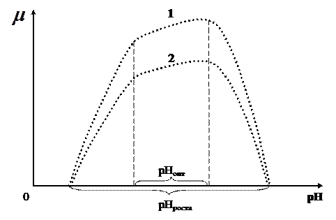 Рис. 2.7. Зависимость удельной скорости роста от рН при отсутствии лимитирования роста по субстрату (1) и в условиях лимитирования роста по субстрату (2)