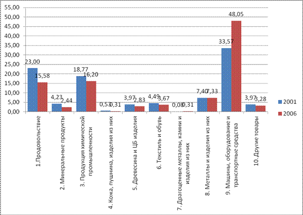 4) Таким образом можно сделать, что структура 2001 и 2006 г в среднем отличается на 2,94%, а 14,707% составляют фактические различия двух структур от величины их предельных различий. В 2006-м году заметно увеличилась доля машин, оборудования и транспотных средст на 16,48% и уменьшилось продовольствие на 7,42%