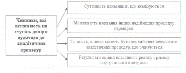 Для ефективнішого збору аудиторських доказів аудитор зобов’язаний грамотно планувати, які аналітичні процедури, в яких кількості й обсязі необхідно виконати для збору потрібних даних. Відповідно до МСА 520 “Аналітичні процедури” аудитор має використовувати аналітичні процедури як на стадії планування, так і на заключній стадії аудиторської перевірки: − під час планування процедур отримання аудиторських доказів та їх кількості; − для перевірки на суттєвість, якщо використання аналітичних процедур може бути ефективнішим, ніж інші процедури перевірки; − як завершальний огляд фінансової звітності на заключній стадії аудиту. Використання аналітичних процедур ґрунтується на припущенні наявності певного причинно-наслідкового взаємозв’язку між показниками, що аналізуються. Наявність таких взаємозв'язків забезпечує отримання аудиторських доказів за оцінкою повноти, точності і достовірності даних, сформованих системою бухгалтерського обліку. Проте ступінь довіри до результатів аналітичних процедур визначається самим аудитором. Він залежить від оцінки аудитором ризику того, що аналітичні процедури зможуть виявити саме ті взаємозв'язки, які їм передбачалися, тоді як насправді має місце істотне спотворення показників фінансової звітності. Оцінка аудитором ступеня довіри, в якому він може покладатися на аналітичні процедури, залежить від декількох чинників (рис. 2).