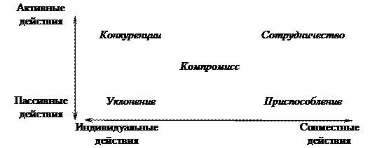 Рис. 10. Сетка Томаса - Килменна 1) Стиль конкуренции или соперничества наиболее типичен для поведения в конфликтной ситуации, выражается в стремлении к одностороннему выигрышу, удовлетворению в первую очередь собственных интересов. 2) Сотрудничество – наиболее трудный, но вместе с тем наиболее эффективный стиль при разрешении конфликтных ситуаций. В данном случае участники находят наиболее приемлемое для обеих сторон решение, превращаясь из оппонентов в партнеров. Стороны нацелены на поиск путей удовлетворения нужд всех. 3) Компромиссный стиль поведения в конфликтной ситуации предполагает урегулирование сторонами разногласия, идя на взаимные уступки. Компромиссный вариант решения проблемы напоминает стиль сотрудничества, однако осуществляется на более поверхностном уровне. Этот стиль наиболее эффективен, когда стороны желают одного и того же, но знают, что одновременно их желания нельзя удовлетворить. При использовании данного стиля акцент делается не на решении, которое удовлетворит интересы обеих сторон, а на решении, с которым обе стороны могут согласиться. 4) Стиль уклонение реализуется обычно, если конфликт не затрагивает прямых интересов сторон или возникшая проблема не столь важна для сторон и у них нет нужды отстаивать свои права, или если невовлеченность в него не отражается на развитии конфликта. 5) Стиль приспособление предполагает, что один из участников конфликта действует совместно с другой стороной, но при этом не пытается отстаивать собственные интересы в целях сглаживания атмосферы и восстановления нормальной рабочей обстановки. Конфликты как продуктивные, так и деструктивные, выполняют ряд функций: 1) разрушительную (деструктивную), которая проявляется в негативных последствиях конфликта: неприязни, эмоциональной напряженности, психических травмах; 2) созидательную (конструктивную), которая заключается в преодолении трудностей, кризисов, улучшении психологического климата, утверждении социально-позитивных норм общения; 3) диагностическую, которая связана с пониманием причин возникновения конфликта, мотивов его участников.