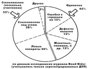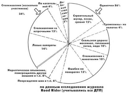 По статистике Хёрта, у более мощных машин шансов попасть в аварию меньше, чем у их маленьких собратьев (если учитывать количество тех и других на дорогах). Возможно, частично это объясняется тем, что на более мощные мотоциклы переходят, уже получив от жизни кое-какой опыт и несколько уроков выживаемости в плотном трафике. Но не забывай, что в отчете Хёрта главным образом рассматривается движение в городах. А ведь есть еще довольно много сельских жителей и любителей загородных трасс. В начале 80-х журнал Road Rider решил узнать, в какие происшествия (включая незарегистрированные) чаще всего попадают на дорогах мотоциклисты. Разумеется, это исследование не было таким же обширным и всесторонним, как у Хёрта, зато данные для нее поступали со всей страны. Сначала о зарегистрированных происшествиях. Объем двигателя Процент ДТП Распространенность машины 000-100 кубов 09% 08% 101-250 кубов 13% 09% 251-500 кубов 37% 26% 501-750 кубов 25% 34% 751 и более кубов 16% 23% По информации читателей Road Rider, в два раза чаще в них страдают только сами мотоциклисты, и большинство происшествий связано с дефектами дорожного покрытия и дикими животными. В отчете Хёрта на долю одиночек приходится 26% всех ДТП. Поданным журнала Road Rider, таких происшествий 45%. И эти цифры не лишены логики, так как значительная часть ДТП произошла на периферийных трассах, вдали от большого города. Это исследование высветило и еще кое-что: значительная часть происшествий с участием мотоциклистов остается незарегистрированной. Например, кто-то поскальзывается на гравии и задевает чей-то мотоцикл. Если мотоциклист пострадал не сильно и в состоянии ехать дальше, то полицию не вызывают и власти не вмешиваются. Поврежденный мотоцикл доставляется домой либо своим ходом, либо на грузовичке приятеля - все решается полюбовно. Когда мы включили сюда незарегистрированные происшествия, полученные цифры еще сильнее стали отличаться от статистики Хёрта. Оказалось, что на долю одиночек приходится 66% всех ДТП, как зарегистрированных, так и нет. Как видишь, исследование журнала Road Rider выявило большее количество дорожных происшествий с мотоциклистами-одиночками, чем отражено в отчете Хёрта. К тому же основная часть вызвана дефектами дорожного полотна, животными и ошибками водителя на вираже. Эти данные вполне обоснованы, потому что именно эти происшествия случаются за городом. Тут нужно помнить, что пострадать в таком одиночном ДТП можно не меньше, чем при столкновении с другим транспортным средством. И потом, исследование журнала Road Rider не является одним из тех огромных, финансируемых правительством университетских проектов. Так что оно отражает опасности иначе, чем отчет Хёрта (и, возможно, более правдиво). Именно поэтому я хотел бы остановиться несколько подробнее на рисках, связанных, например, с дефектами полотна и выскакивающими на трассу дикими животными. Водительские курсы, как правило, обходят такие вопросы стороной.