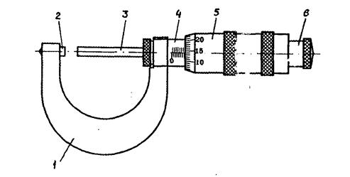 Микрометр (рис. 2) состоит из скобы 1, на одном конце которой имеется неподвижная пятка 2 с измерительной поверхностью, а на другом - стебель 4. Внутри стебля по втулке перемещается микрометрический винт 3, скрепленный с барабаном 5. Барабан соединен с приспособлением для поддержания постоянства измерительного усилия - трещоткой 6. Размеры отсчитывают по двум шкалам - стебля 4 и барабана 5. По шкале стебля 4, левее скоса барабана 5, отсчитывается число целых миллиметров. над продольной чертой (индекс) шкалы 4 нанесены отметки, соответствующие серединам делений этой шкалы. По круговой шкале барабана и индексу отсчитывают сотые доли миллиметра.