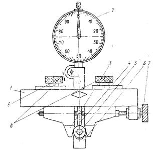 Для обеспечения нормальных условий смазки и компенсации погрешностей изготовления и монтажа в зубчатых передачах путем радиального смещения исходного контура рейки создают боковой зазор между неработающими профилями сопряженных зубьев. С целью обеспечения в передаче гарантированного бокового зазора осуществляют дополнительное смещение исходного контура ЕHr от его номинального положения в тело зубчатого колеса (рис. 27). Наименьшую величину ЕHr нормируют в зависимости от степени точности по нормам плавности и вида сопряжения и обозначают: для зубчатых колес с внешними зубьям -ЕHs, для колес с внутренними зубьями через + EHi. Допуск TН на дополнительное смещение исходного контура установлен от допуска на радиальное биение Fr и вида сопряжения, причем для всех видов сопряжения ТН > Fr. Зубомеры смещения предназначены для определения положения исходного контура относительно наружного диаметра цилиндрических зубчатых колес внешнего зацепления с модулями от 2 до 50 мм и углом исходного контура 20° по ГОСТ 1643-81. Прибор (рис. 28) состоит из корпуса 1 с симметрично расположенными губками 3, которые одновременно перемещаются посредством винта 7 и закрепляются в нужном положении гайками 8. В корпусе прибора устанавливается индикатор 2 с удлиненным сменным измерительным наконечником 4. По перемещению наконечника индикатора, опирающегося на окружность выступов зубьев, определяют величину смещения исходного контура. Настройка зубомеров смещения производится по специальным калибрам-роликам 5, прилагаемым к прибору, которые помещают в призму специальной стойки 6.