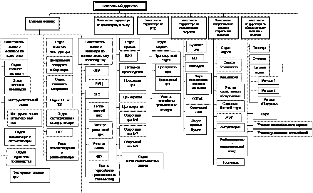 Характеристика проекта типа PIES Характеристика проекта типа EU12 Введение ОРГАНИЗАЦИОННОЙ СТРУКТУРЫ СОВЕРШЕНСТВОВАНИЕ Деловая игра 1. ПРЕДПРИЯТИЯ» [1] Задача менеджеров состоит в том, чтобы выбрать ту структуру предприятия, которая лучше всего отвечает целям организации, а также воздействующим на нее внутренним и внешним факторам. Оптимальная структура организации позволяет наиболее результативно взаимодействовать с внешней средой, продуктивно и целесообразно распределять и направлять усилия сотрудников и, таким образом, удовлетворять потребности клиентов и достигать целей организации с высокой эффективностью. Международный центр социально-экономических исследований (МЦСЭИ) «Леонтьевский центр» по заказу Российского центра приватизации провел Анализ последствий реструктуризации российских предприятий. На этих предприятиях осуществлялись проекты EU 12, PIES и FMA при технической помощи Мирового банка реконструкции. Цель проекта: диагностика хозяйственной деятельности предприятия с целью выработки рекомендаций в сфере управления производством. Содержание работ: разработка рекомендаций по совершенствованию маркетинга, организационной структуры, финансового менеджмента, бизнес-планов, поиск партнеров по бизнесу и инвесторов. Цель проекта: повышение эффективности производства в новых экономических условиях. Содержание работ: проведение на нескольких «типичных» предприятиях реструктуризации и реорганизации хозяйственной деятельности при содействии консультантов мирового класса; документирование результативно успешных подходов к решению общих для большинства приватизированных предприятий задач и распространение их на другие предприятия в качестве своего рода «стандартов». Цель проекта: ускорение реконструкции приватизированных средних и крупных предприятий. Содержание работ: совместная работа групп западных и российских консультантов по программе содействия в области управления, главным образом, по следующим четырем основным разделам: финансовая и управленческая отчетность; управление денежными операциями; управленческий учет и конкретные функции системы управления; инвестиционное содействие. В рамках этих проектов работали группы западных консультантов из таких известных фирм, как Мак Кинзи, Деллойт де Туш, Аpmyp Д. Литтл, Карана, Бракстон Ассошиейтс. Одним из результатов работы консультантов на российских предприятиях являются предложения по совершенствованию организационной структуры предприятия. Цель игры: определение основных направлений совершенствования организационной структуры промышленного предприятия на основе изучения и сравнительного анализа существующего и предлагаемого консультантами вариантов структур. Исходные данные: для изучения и сравнительного анализа предлагается рассмотреть организационные структуры трех предприятии. Предприятие № 1 является открытым акционерным обществом и относится к электротехнической промышленности. Оно производит светотехническое оборудование для автомобильной промышленности. Численность персонала предприятия на конец 1999 г. составлю 4029 чел. Схема организационной структуры предприятия, действовавшей на конец 1999 г., представлена на рис. 1. Схема организационной структуры, предложенной консультантами, представлена на рис. 2. Предпри