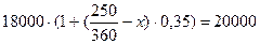 Решение Т.к. платежи краткосрочные, то применим простую ставку, например, 20%. Получим: P1 = 400/ (1+ 4/12*0,2) = 375,00 (тыс. руб) P2 = 450/ (1 + 8/12 *0,2) = 397, 06 (тыс. руб) Как видим, сравниваемые обязательства не являются эквивалентными при заданной ставке и в силу этого не могут адекватно заменять друг друга. Какое из условий более выгодно? Рассчитаем критический размер ставки: i0 = (1 – 400/450) /(400/450 *8/12 – 4/12) = 0,428 = 42,8% Вывод: При i < 42,8% условия второго обязательства более выгодные, т.к. P2>P1, при i > 42,8% более выгодным является второе обязательство, т.к. получаем P1>P2. Пример 20 Определить срок платежа, если обязательство в 20 тыс. руб. с уплатой через 250 дней предполагается заменить платежом в 18 тыс. руб. При замене используется простая процентная ставка 35% годовых. Временная база равна 360 дней. По условию новый срок должен быть меньше 250 дней, т.к.18 тыс. руб. меньше чем 20 тыс. руб. Обозначим новый срок платежа через x лет. За дату приведения выберем 250 дней. В силу принципа финансовой эквивалентности обязательств, получим уравнение: