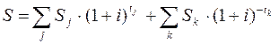 где Sj - размеры объединяемых платежей со сроками, меньшими n ( Sk - размеры платежей со сроками, большими n ( tj = n – nj, tk = nk – n При консолидации платежей может применяться как сложная процентная ставка, так и учетная ставка. Например, при консолидации платежей по сложной процентной ставке, получим: