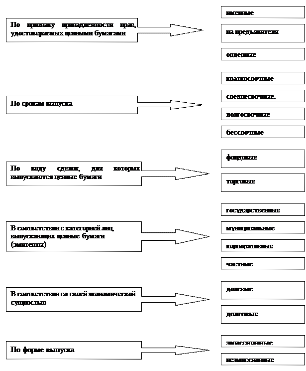 В экономической литературе и в юридических документах можно встретить различные определения понятия «ценная бумага». Так, в Гражданском кодексе РФ указывается, что ценной бумагой является документ, удостоверяющий с соблюдением установленной формы и обязательных реквизитов имущественные права, осуществление или передача которых возможны только при его предъявлении. Подобное определение является весьма широким и охватывает такие документы, как, например, платежные поручения и аккредитивы, которые не считаются ценными бумагами в общепринятом смысле. В экономической литературе используются следующее определение ценной бумаги - это документ, устанавливающий отношения собственности или займа между его владельцем и лицом, его выпустившим. Первым видом ценных бумаг был вексель, представляющий собой одну из форм кредитных денег. Далее в процессе развития банков появляется еще одна форма ценных бумаг - чеки, также выполняющие функцию кредитных денег и опосредующие движение товаров в качестве платежного средства. Наибольшее влияние в экономике ценные бумаги приобрели при создании акционерных обществ, которые объединяют индивидуальные капиталы в один ассоциированный капитал путем выпуска своих акций. Выпуск акционерными обществами акций, а затем долговых ценных бумаг - облигаций позволил мобилизовать капитал для расширения производства, способствовал вовлечению населения в сферы рыночных отношений, воспитанию в обществе экономической культуры. Кроме акций существенное влияние на экономику оказывает выпуск ценных бумаг государством. Это использовалось сначала для покрытия расходов государства. Классификация ценных бумаг Ценные бумаги можно классифицировать по следующим признакам: