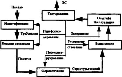 Методы и модели представления знаний. (Попов) Этапы разработки экспертных систем. (Попов) Разработка ЭС имеет существенные отличия от разработки обычного программного продукта. Опыт создания ЭС показал, что использование при их разработке методологии, принятой в традиционном программировании, либо чрезмерно затягивает процесс создания ЭС, либо вообще приводит к отрицательному результату. Дело в том, что неформализованность задач, решаемых ЭС, отсутствие завершенной теории ЭС и методологии их разработки приводят к необходимости модифицировать принципы и способы построения ЭС в ходе процесса разработки по мере того, как увеличивается знание разработчиков о проблемной области. Перед тем как приступить к разработке ЭС, инженер по знаниям должен рассмотреть вопрос, следует ли разрабатывать ЭС для данного приложения. В обобщенном виде ответ может быть таким; использовать ЭС следует только тогда, когда разработка ЭС возможна, оправдана и методы инженерии знаний соответствуют решаемой задаче. Ниже будут уточнены использованные понятия "возможно", "оправдано", "соответствует". Чтобы разработка ЭС была возможной дляданного приложения, необходимо одновременное выполнение по крайней мере следующих требований: 1) существуют эксперты в данной области, которые решают задачу значительно лучше, чем начинающие специалисты; 2) эксперты сходятся в оценке предлагаемого решения, иначе нельзя будет оценить качество разработанной ЭС; 3) эксперты способны вербализовать (выразить на естественном языке) и объяснить используемые ими методы, в противном случае трудно рассчитывать на то, что знания экспертов будут "извлечены" и вложены в ЭС; 4) решение задачи требует только рассуждений, а не действий; 5) задача не должна быть слишком трудной (т.е. ее решение должно занимать у эксперта несколько часов или дней, а не недель); 6) задача хотя и не должна быть выражена в формальном виде, но все же должна относиться к достаточно "понятной" и структурированной области, т.е. должны быть выделены основные понятия, отношения и известные (хотя бы эксперту) способы получения решения задачи; 7) решение задачи не должно в значительной степени использовать "здравый смысл" (т.е. широкий спектр общих сведений о мире и о способе его функционирования, которые знает и умеет использовать любой нормальный человек), так как подобные знания пока не удается (в достаточном количестве) вложить в системы искусственного интеллекта. Использование ЭС в данном приложении может быть возможно, но не оправдано. Применение ЭС может быть оправдано одним из следующих факторов: • решение задачи принесет значительный эффект, например экономический; • использование человека-эксперта невозможно либо из-за недостаточного количества экспертов, либо из-за необходимости выполнять экспертизу одновременно в различных местах; • использование ЭС целесообразно в тех случаях, когда при передаче информации эксперту происходит недопустимая потеря времени или информации; • использование ЭС целесообразно при необходимости решать задачу в окружении, враждебном для человека. Приложение соответствует методам ЭС, если решаемая задача обладает совокупностью следующих характеристик: 1) задача может быть естественным образом решена посредством манипуляции с символами (т.е. с помощью символических ра