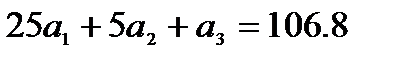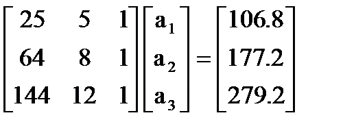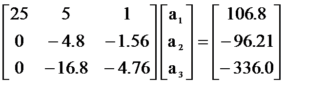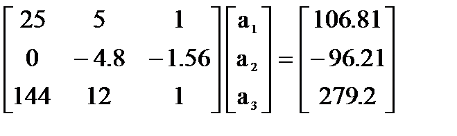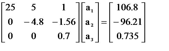 Find the values of a1, a2, a3 using Naïve Guass Elimination. Find the velocity at Forward Elimination of Unknowns: Since there are three equations, there will be two steps of forward elimination of unknowns. First step: Divide Row 1 by 25 and then multiply it by 64
