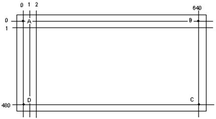 А(0, 0) – координата 1-й точки в левом верхнем углу, В(640, 0), С(640, 480) и D(0, 480).