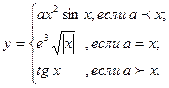 10 REM Иванов В.П., гр.107…,вариант 1–3 20 PRINT 30 PRINT 40 A=1.45 50 X=.57 60 IF A<X THEN y=A*X^2*SIN(X) ELSE IF A=X THEN Y=EXP(3)*SQR(ABS(X)) ELSE Y=TAN(X) 90 PRINT ”Исходные данные”