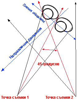 Обратите внимание: · не пересекается линия движения, то есть правило по направлению движения соблюдено; · не пересекается линия общения, если идущим людям вздумается поболтать между собой, то правило направления взгляда тоже будет соблюдено; · если судить по тому, какие углы у камер относительно людей, то можно сказать, что правило крупности мы тоже соблюли: с точки съемки 1 мы показываем первый средний план, а с точки съемки 2 - общий; · наконец, две красные линии, обозначающие биссектрисы углов наших камер, пересекаются под углом 45 градусов, именно об этом мы сейчас и говорим.