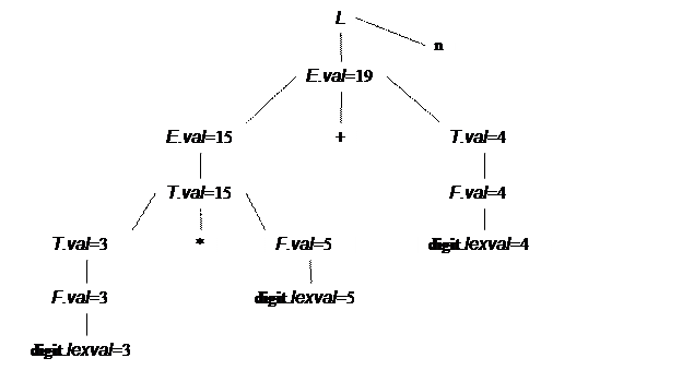 Синтезируемые атрибуты часто используются на практике. S-атрибутным определением называется синтаксически управляемое определение, использующее только синтезируемые атрибуты. Дерево разбора для S-атрибутного определения всегда может бытьаннотировано путем выполнения семантических правил для атрибутов в каждом узле снизу вверх, от листьев к корню. S-атрибутное определение в примере 30 описывает калькулятор, считывающий арифметическое выражение из цифр, скобок, операторов + и *, за которым следует символ новой строки n, и выводит значение выражения. Например, получив выражение3*5+4, за которым следует символ новой строки, программа выводит значение 19. Нарис. 50 показано аннотированное дерево разбора для входной строки 3*5+4n. Выход программы, печатаемый в корне дерева, представляет собой значение E.val впервом дочернем узле корня дерева. Вычисление значений атрибутов производится следующим образом. Крайнему слева снизу внутреннему узлу соответствует использование продукции F → digit. Семантическое правило F.val:= digit .lexval определяет атрибут F.val вэтом узле как имеющийзначение 3, поскольку значение digit. lexval вдочернем узле равно 3. Аналогично вродительском по отношению к данному узлу атрибут T.val также имеет значение 3.