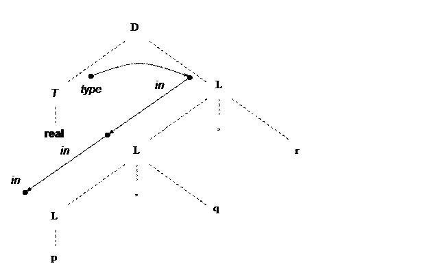 Тип идентификатора может быть передан с помощью правил копирования и наследуемых атрибутов, как показано на рис. 60. Рассмотрим действия восходящего синтаксического анализатора при входной строке real р, q, r Значение атрибута Т.tуре можно получить при использовании продукции для L. Схема трансляции имеет следующий вид