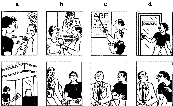Task 1. Прослухайте наступний текст: A young man was called up for army service, but he didn't want to become a soldier. When he went for his medical exam, he pretended that his eyesight was very bad. The doctor pointed to the eye chart on the wall and said, “Please read the top line.” “The top line of what?” the young man asked. “The top line of the chart,” the doctor replied. “What chart?” the man asked. “The one on the wall,” the doctor said. “What wall?” the man asked. Finally, the doctor decided that the man’s eyes were not good enough for army service. That evening the same young man was at a movie when another man came in and sat next to him in the dark. When the lights went on, the young man saw that his neighbor was the doctor who had examined him earlier. Immediately he said, “Excuse me, ma’am, but does this bus go to Main Street?” Task 2. Дайте відповіді на запитання: