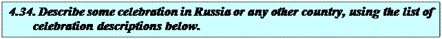 meaning of name, traditional dances, history, date, music and songs, preparation for celebration, traditional clothes, gift giving, typical activities