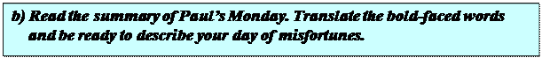 Yesterday morning Paul had a lot of problems. First, he dropped a cup and it broke. It was his girl-friend’s favourite cup. He got another cup, made coffee, and then spilt it. It ruined his T-shirt because there was a large coffee stain on it. He decided to make some toast, but he burnt the first piece, then he realized that he’d run out of bread. He didn’t leave home in a good mood, moreover he was hungry. After Paul went out, things got worse. He left home with a ten-pound note in his pocket, and walked to a bus stop. Unfortunately, he was a bit late and the bus was a bit early, so he missed the bus. While he was waiting for the next one, he got out his walkman, but the batteries had run out. When the bus arrived, he got on and put his hand in his pocket – no ten-pound note – he had lost his money. The driver told him to get off. He didn’t want to be late for school, so he started running. Moments later, he saw a dog, but not its lead – he tripped over the lead. He got to his feet, carried on to school, then he realized he had left his bag on the bus. And he was late for school in the end.