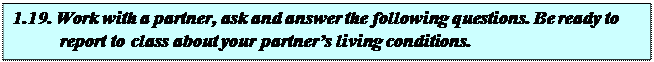 1. Where do you live? 2. Do you live in a detached house or in a block of flats? If you live in a block of flats – is it made of brick, panel, or cast? 3. Is there a garden in front of your house? 4. What is there next to your house? 5. Is your house far from a bus stop/ underground? 6. What floor is your flat on? 7. What modern conveniences are there in your flat/ house? 8. Is your flat/ house large or small? 9. How many rooms are there in your flat/ house? What are they? 10. Which is the biggest room in your flat/ house? 11. How is your living room furnished? 12. Do you often get together in your living-room? 13. In what room do you receive guests? 14. Where do you keep your clothes? 15. Where do you keep your books? 16. Where do you usually have meals? 17. Are you happy with your flat/ house?