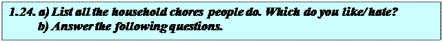 1. What is the most hated chore? Why? How often do you do it? Who usually does it? 2. Who does most of the chores in your house? 3. How do you typically avoid doing chores? What are your regular excuses: studying? Going out? It is not your turn? 4. Do you recycle your rubbish? What do you do if the container is full? 5. Who does the odd jobs around your house – electrical, hammering, painting? 6. Who does the shopping? 7. Who cuts the grass (if you live in a house)? Who waters the houseplants? 8. Who washes the dishes? 9. Who cooks?