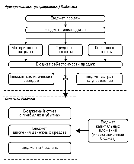 Как правило, структурирование корпоративного бюджета предусматривает наличие двух групп планов — функциональных (или операционных) бюджетов и основного бюджета (иногда его называют мастер–бюджетом). Типовая структура бюджета схематично может быть представлена так, как показано на рисунке.