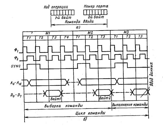 Устройство управления Устройство управления является одним из важнейших блоков ЦП. Совместно с генератором тактовых сигналов устройство управления обеспечивает, чтобы события в микро-ЭВМ происходили в правильной последовательности. После извлечения команды из памяти и ее дешифрирования устройство управления генерирует последовательность сигналов, необходимую для выполнения команды. Кроме этого, устройство управления способно самостоятельно реагировать на различные внешние сигналы, например, на сигналы прерывания от внешних устройств. Сигнал готовности, поступающий из памяти или порта УВВ, также воспринимается устройством управления. Временные диаграммы Характеристики МП обычно публикуются их изготовителями в виде временных диаграмм, на которых последовательность событий представляется как функция времени, причем временную диаграмму можно построить для любой операции, выполняемой микро-ЭВМ. Ниже рассматривается временная диаграмма выполнения команды ввода (рис.4.3).