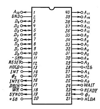 Все МП должны иметь соединения с шиной адреса, которая используется для передачи адресов памяти или одному из УВВ. Так как адресация 16-разрядная, то необходимо иметь 16 внешних выводов А0-А15. В некоторых МП некоторые выводы шины адреса выполняют двойную функцию: по ним передаются или значения соответствующих бит адреса, или информация о процессах записи-считывания в памяти. Иногда восемь из шестнадцати выводов шины адреса могут использоваться для подключения в шине данных в режиме мультиплексирования. D0-D7 – выводы двунаправленной шины данных. Шина данных является двунаправленной и поэтому эти выводы используются для передачи информации в ЦП и из него. Ф1-Ф2 – тактовые входы, на которые подаются сигналы тактирования от внешней ИС. SYNC – выход синхронизации. С этого вывода снимается сигнал синхронизации, который оповещает память или УВВ о начале нового машинного цикла, чем обеспечивается согласование работы этих устройств с работы ЦП во времени. Выводы для подключения напряжения питания. На ЦП подается напряжение питания +12, -5, +5 В и он подключается к общей точке GND (ground - земля) источника питания. Другие типы МП могут иметь один источник питания +5 В. RESET – вход гашения (сброса). По этому входу можно сбрасывать счетчик команд, т.е. устанавливать его значение 0000(16), и затем передавать в регистр адреса нулевой адрес первой исполняемой команды. После подачи сигнала сброса RESET содержимое всех других регистров ЦП остается неопределенным. WR – выход сигнала "Запись". Информация передается по шине в двух направлениях: из ЦП в память или порт УВВ либо в противоположном направлении. ЦП должен информировать память или порт УВВ о выполнении им операции записи (WRITE) или чтения (READ). ЦП указывает на то, что выполняется операция записи путем подачи сигнала высокого или низкого уровня на вывод WR (write). READY – вход сигнала готовности. Если необходимо произвести обмен данными между памятью или УВВ и ЦП, то перед началом передачи данных следует указать адрес модуля, которому передается информация или, наоборот, от которого она принимается. Этот адрес декодируется в памяти или порте УВВ, что позволяет определить источник либо место назначения передаваемых данных. Однако, прежде чем сможет начаться действительно начаться обмен данных, происходит некоторый промежуток времени, который называется временем доступа. То, что этот промежуток времени истек, отражается в посылке памятью или портом УВВ сигнала готовности на соответствующий вход МП. Это дает ЦП информацию о том, что может начаться обмен данными. WAIT – выход сигнала ожидания. ЦП указывает, что он находится в режиме ожидания, путем подачи сигнала на вывод WAIT. DBIN – выход сигнала "шина данных в режиме ввода". Если в ЦП передаются данные при считывании их из памяти или при выполнении операции ввода, то он указывает на это путем генерации сигнала на выводе DBIN (data bus in). При считывании из памяти сигнал DBIN отображает команду READ, а при выполнении операции ввода команду IN. HOLD – вход сигнала захвата шин. HLDA – выход сигнала подтверждения захвата шин. Большие объемы информации, хранящиеся на магнитных дисках, могут передаваться в основную память микро-ЭВМ без вмешательства ЦП. Такой режим называют прямым доступом к памяти (ПДП). В этом режиме ЦП должен отключаться от шин адреса и данных. Это происходит при появлении с