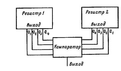 Данная схема осуществляет сравнение содержимого двух регистров. Если состояние триггеров в обоих регистрах одинаково, то содержимое двух регистров одинаково.