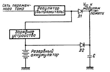 Энергонезависимая система полупроводниковой памяти. Для решения проблемы энергонезависимости памяти при отключении питания используется резервный источник питания, в качестве которого используется резервное аккумуляторное питание. Это возможно потому, что некоторые МОП-памяти в режиме хранения потребляют намного меньше энергии по сравнению с активным режимом.