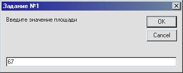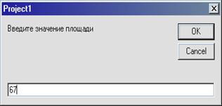 В текстовое поле введено значение 67. Когда пользователь нажимает кнопку ОК, содержимое поля присваивается переменной S. Если пользователь нажал кнопку CANCEL, возвращается строка нулевой длины. Если видоизменить вызов функции следующим образом: S = InputBox("Введите значение площади", "Задание № 1"),