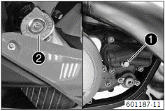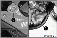 | Состояние Двигатель холодный. – Установить мотоцикл вертикально. – Поместить под крышку насоса системы охлаждения подходящую сливную емкость. | ||||