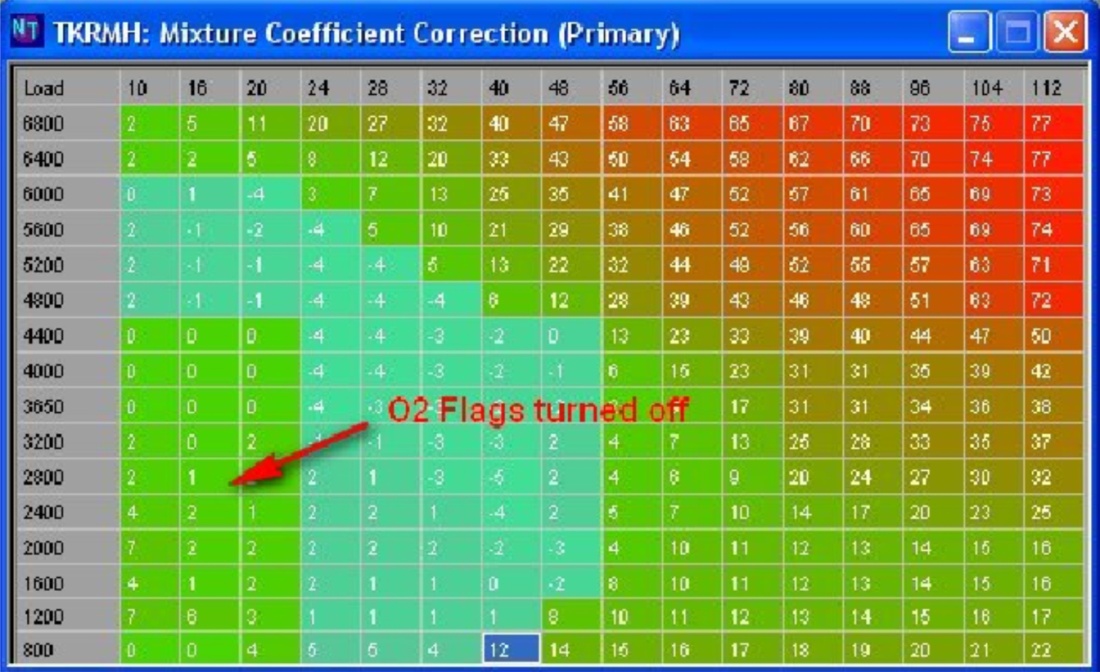 2. Отключите датчик O2 в управления с обратной связью флагов (при наличии). 2. Отключите O2 Обратная связь для отдельных клеток в карте топлива. Выделите ячейку и используйте ключ 'O' для переключения O2 Обратная связь. Это возможно только тогда, когда AFR богаче 14,7:1. Nissan ЭКЮ не может отключить O2 Обратная связь для компактнее, чем 14,7:1, потому что карта не имеет необходимого числовой разрешение сделать это.