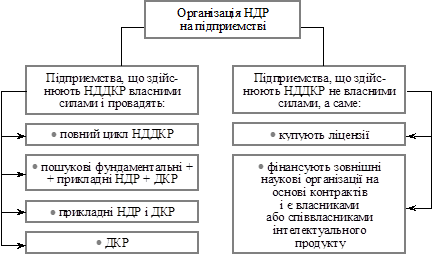 Рис. 7.7. Організація інноваційного процесу на підприємстві Під час здійснення на підприємстві повного циклу НДДКР важливими є взаємовідносини керівництва підрозділів НДДКР з вищим рівнем керівництва організації, що визначає політику фірми у сфері інноваційної діяльності, і оперативними підрозділами, що є провідними в процесі впровадження результатів НДДКР у виробництво. Виникає проблема збереження балансу між довгостроковими фундаментальними дослідженнями, які забезпечують організації виживання в майбутньому, і прикладними дослідженнями, що забезпечують поточну, сьогоденну конкурентну перевагу на ринку. З урахуванням сказаного важливою передумовою довгострокових планів досліджень є: знання тенденцій розвитку науково-технічного прогресу на тривалу перспективу; стратегії фірми у сфері технологій; відповідність завдань НДДКР цілям фірми, узгодженість усіх видів діяльності з забезпечення інноваційного процесу на підприємстві, його неперервності. Як свідчить практика, слабкою ланкою інноваційного процесу є перехід нововведення від одного організаційного підрозділу до іншого, наприклад, від НДР до ДКР, від ДКР до виробництва, від виробництва до збуту — порушується неперервність процесу, збільшуються витрати і час на розроблення. Така ситуація зумовлена організаційними особливостями завдань, що впливають на методи ефективного узгодження спільної діяльності цих підрозділів. Основну роль при цьому відіграють такі особливості в структурі функцій і завдань окремих підрозділів: