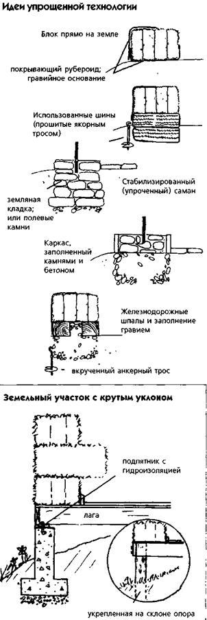Другие варианты фундаментов Строительные участки с уклоном представляют проблему для строителя из соломенных блоков. Использование подхода "выемки и насыпки грунта" может потребовать массивного перемещения земли, что приведет к опасно "прорезанным" стенам, требующим фиксации. Ступенчатые фундаменты имеют свои проблемы, включающие возможность дифференцированной осадки, вызванной различным числом рядов блочной кладки в несущих каркасах. Лучшим решением может оказаться использование решетки вертикальных свай или столбов, поддерживающих деревянную платформу, на которую может ставиться дом из соломенных блоков. Пространство под платформой может быть закрыто ограждением (из соломенных блоков?) и использоваться для хранения (это было бы отличным местом для хранения воды, собранной с крыши).