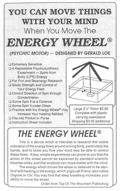 Experimental Mind Machine Supplies ENERGY WHEEL® by Gerald Loe As pictured on page 68, complete with instructions. Easier to turn because of less mass (?). $5.95 plus $3.00 shipping HIERONYMOUS TILE 2" X 2" Tile as described on page 152. $3.00 includes shipping SYMBOL EXPERIMENTERS PACK Contains Left-Hand Spiral, Right-Hand Spiral, Special Strengthening or Weakening test card (not shown in book) all printed on 5.5" x 8.5" Vellum Bristol card stock. $3.00 includes shipping COMPLETE EXPERIMENTERS PACK Includes Loe Energy Wheel®, Hieronymous Tile and Symbol Pack. Special $9.95 plus $3.00 shipping Check or M.O. payable to: Powell Productions Send to: TOP OF THE MOUNTAIN PUBLISHING 11701 South Belcher Road, #123 Largo, Florida 34643-5117 Fax 813 536-3681 Phone 813 530-0110 Fax, Phone or Write for FREE Catalog