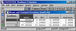 - ее математическое описание, - число искомых параметров, - тип функции потерь, - название переменных, - автоматическое исключение строки при отсутствии в ней одной из переменных, - количество обрабатываемых строк. Ниже расположены инструменты для задания условий аппроксимации и вывода результатов. Раскрывающийся список Estimation Method позволяет указать метод подбора искомого параметра. Рекомендуется оставить метод Quasi-Newton (метод Ньютона последовательных приближений способом касательных). Он обеспечивает быструю сходимость итераций. Флажок Asymptotic standard errors необходимо установить для вывода стандарта асимптотической (в итоге итераций) погрешности оценки искомого параметра. Флажок Eta for finite difference approximation (Eta≈10-8 – параметр сглаживания) доступен при установке флажка Asymptotic standard errors. В раскрывающемся списке Maximum number of iterations указывается максимальное число итераций при подборе параметра (достаточно 50). Раскрывающийся список Convergence criterion (Критерий сходимости) позволяет установить погрешность вычислений (можно оставить ≈0,0001). Кнопка Start values выводит диалоговое окно для задания начального значения функции потерь (остается величина, устанавливаемая по умолчанию). Кнопка Initial step sizes выводит диалоговое окно для задания шага вычислений при подборе параметра (остается величина по умолчанию). Кнопка Means and standard deviations используется для вывода таблицы средних значений, стандартов и границ переменных (см. рисунок ниже).