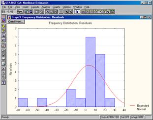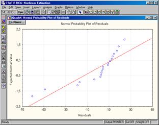 Кнопка Distribution of residuals выводит для распре-деления остатков гистограмму и сглаживающую кривую нор-мального закона. Однако более наглядно согласие распреде-ления остатков с нормальным законом проявляется на диаг-рамме со шкалами, спрямляю-щими интегральную кривую при нормальном распреде-лении. Диаграмма вызывается щелчком по кнопке Normal probability plot of residuals.