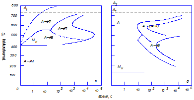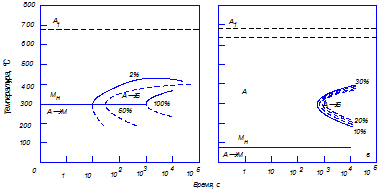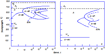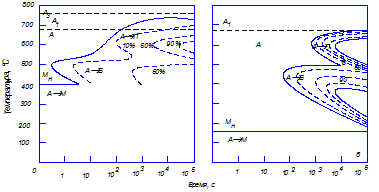 Рис.1. Диаграммы изотермического распада переохлажденного аустенита стали 15Х (а) и 18ХГТ (б)