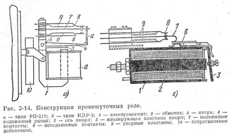 Простейший пример использования промежуточного реле всхемах защиты приведен на рис. 2-13, а — в. Промежуточные реле по способу включения подразделяются на реле параллельного (рис. 2-13, а) и последовательного (рис. 2-13, б) включения. Обмотки первых включаются на полное напряжение источника питания, а вторых — последовательно с катушкой отключения выключателя или какого-либо другого аппарата или реле на ток цепи. Кроме того, выпускаются реле с дополнительными удерживающими катушками, например реле параллельного включения с удерживающей обмоткой, включаемой последовательно в управляемую контактами реле цепь (рис. 2-13, в). Такое реле, подействовав от кратковременного импульса, поданного в параллельно включенную обмотку, остается в сработанном состоянии под действием тока удержания, пока не завершится операция. Для одновременного замыкания нескольких не связанных друг с другом цепей промежуточные реле имеют несколько контактов. Мощность контактов должна быть достаточной для замыкания и размыкания цепей защиты (обычно потребляющих 50— 200 Вт) или цепей управления выключателей (1500—2000 Вт). Потребление обмоток реле параллельного включения стремятся ограничить до 3—6 Вт, с тем чтобы их цепь могли замыкать реле с маломощными контактами. Потребление обмоток реле последовательного включения выбирается из условия минимального падения напряжения в сопротивлении обмотки этого реле, которое допускается не более 5—10% нормального напряжения источника оперативного тока. Промежуточные реле должны надежно действовать не только при нормальном напряжении, но и при возможном в условиях эксплуатации его понижении, достигающем 15—20%. С учетом запаса напряжение срабатывания реле параллельного включения принимается 60—70% номинального значения. К коэффициенту возврата промежуточных реле не предъявляется каких-либо требований, так как их возврат происходит при отсутствии тока в обмотке реле. В схемах защиты промежуточные реле вносят нежелательное замедление, поэтому, за исключением особых случаев, их время должно быть очень малым, особенно когда они применяются в быстродействующих защитах. Быстродействующие промежуточные реле должны работать со временем не более 0,01—0,02 с. Время срабатывания обычных промежуточных реле колеблется в зависимости от конструкции от 0,02 до 0,1 с. б) Конструкции промежуточных реле постоянного тока [Л. 10] Большинство промежуточных реле выполняется при помощи системы с поворотным якорем, позволяющей создавать большую электромагнитную силу при относительно малом потреблении и Удобной для изготовления многоконтактных реле. Применяются также системы с втягивающимся якорем. На рис. 2-14 показаны образцы промежуточных реле. Реле типа РП-210 (рис. 2-14, а) имеют четыре контакта. Время их срабатывания равно 0,01 с, потребление 5—8 Вт, разрывная мощность контактов 50 Вт. Широкое распространение получили кодовые реле (КДР) (рис. 2-14,б). Время срабатывания этих реле равно 0,01-0,02 с, потребление обмотки не более 3 Вт. Реле последовательного включения отличаются от реле параллельного включения лишь обмоточными данными.