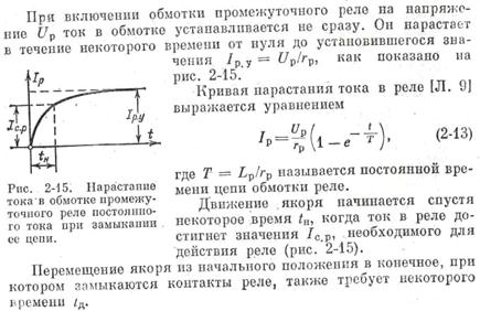 Таким образом, полное время действия реле tр складывается из времени нарастания тока в обмотке якоря tН до значения Iс.р и времени движения якоря tД: tр = tН + tД (2-14) Из диаграммы на рис. 2-15 следует, что tН зависит от скорости нарастания тока Iр, которая определяется постоянной времени Т; величины тока Iс.р, определяемой силой противодействующей пружины реле; величины установившегося тока Iр у. Составляющая tД зависит от величины хода якоря и скорости его перемещения. Абсолютное значение tД невелико (составляет тысячные доли секунды), поэтому у реле постоянного тока время действия практически определяется tН. Для получения быстродействующих промежуточных реле нужно уменьшать Т, ослаблять противодействующую пружину реле и увеличивать кратность тока к = Iр .у/ Iс.р. При включении реле в его сердечнике появляются вихревые токи, замедляющие нарастание магнитного потока и увеличивающие, таким образом, время tН. Поэтому у быстродействующих реле магнитная система выполняется из шихтованной стали. Уменьшение tД в быстродействующих реле достигается в основном путем облегчения подвижной системы и уменьшения трения. К числу быстродействующих реле, применяемых в отечественных защитах, относятся реле типа РП-210—РП-215, кодовые роле КДР-1 и реле МКУ [Л. 101]; их время действия tр = 0,01 с. г) Промежуточные реле постоянного тока замедленного действия В ряде случаев в схемах защиты и автоматики требуются промежуточные реле, замыкающие или размыкающие свои контакты с некоторым замедлением. Замедление в таких реле получается за счет повышения составляющей tН в (2-14) путем увеличения постоянной времени Т обмотки. Замедленное действие реле при втягивании якоря достигается размещением на магнитопроводе 3 короткозамкнутой обмотки 2, выполняемой в виде медной цилиндрической гильзы, или медных шайб, поверх которых наматывается основная обмотка 1 (рис.2-16). При включении обмотки 1 на напряжение Uр магнитный поток Ф1 в магнитопроводе реле устанавливается не сразу.. В момент включения в обмотке 2 возникает ток I2, создающий магнитный поток Ф2, который противодействует нарастанию тока в обмотке 1. В результате этого скорость нарастания тока в обмотке реле уменьшается (рис. 2-17), а время нарастания тока tН увеличивается. Для увеличения времени действия реле необходимо располагать обмотки 1 и 2 концентрически так, чтобы весь магнитный поток Ф2 обмотки 2 пронизывал обмотку 1, и увеличивать магнитный поток обмотки 2. Для этого следует увеличивать сечение медной гильзы (отчего возрастает ток I2) и уменьшать сопротивление магнитопровода реле. Практически выдержка времени на втягивание якоря в промежуточных реле с короткозамкнутой обмоткой относительно невелика и не превосходит 0,5 с.