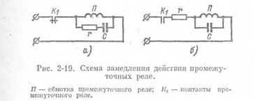 Отечественные заводы изготовляют реле типов РП-250, КДР-3 РЭВ-81, РЭВ-810, РЭВ-880, имеющие замедленный возврат [Л. 101]. Замедление с помощью контура С и r. Замедление при размыкании цепи промежуточных реле может достигаться при помощи схем, состоящих из резистора r (активного сопротивления) и конденсатора С, как показано на рис. 2-19, а, б. В схеме.на рис. 2-19, а конденсатор С разряжается на обмотку П при размыкании контактов К1, благодаря чему время отхода якоря увеличивается. Резистор r ограничивает ток через конденсатор в момент включения реле П. При замыкании контактов К1 на обмотку реле П подается полное напряжение, и поэтому нарастание тока в ней определяется только ее параметрами. В схеме на рис. 2-19, б действие реле замедляется как при замыкании, так и при размыкании цепи обмотки реле П. В момент замыкания контактов К1 происходит заряд конденсатора С. В нем появляется ток IС, создающий повышенное падение напряжения на сопротивлении r. Вследствие этого напряжение на зажимах обмотки реле II уменьшается: UП = U — (IС + IП) r, где U — напряжение источника питания; UП — напряжение на обмотке реле П; IС и Iп — токи в конденсаторе и обмотке реле. Пропорционально этому уменьшается и ток в обмотке П. По окончании заряда конденсатора прохождение тока Iс прекратится и на обмотке реле II установится нормальное напряжение UП = U — IПr. При размыкании контактов К1 конденсатор С разряжается на обмотку реле П, удерживая реле в сработанном состоянии до тех пор, пока ток в обмотке не снизится до значения Iвоз . Чем больше емкость С, тем больше замедлится действие реле. Недостатком замедленных реле является значительный разброс их времени действия, в частности за счет колебания уровня напряжения источника оперативного тока.