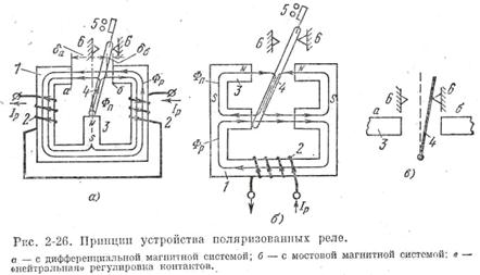 Поляризованные реле являются разновидностью электромагнитных конструкций. В отличие от рассмотренных выше электромагнитных реле якорь поляризованного реле находится под воздействием двух магнитных потоков, из которых один создается током, питающим обмотку реле, а второй — постоянным магнитом. Магнитный поток обмотки называется рабочим, а постоянного магнита — поляризующим. Поляризованные реле выполняются в двух вариантах: с дифференциальной магнитной системой и мостовой. Обе конструкции состоят из сердечника 1, обмотки 2, постоянного магнита 3, якоря 4 и контактной системы 5 (рис. 2-26).