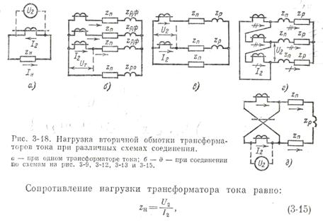 где U 2 и I 2 — напряжение и ток вторичной обмотки (рис. 3-18, а). Чтобы определить zн, нужно вычислить напряжение U 2, равное падению напряжения в сопротивлении нагрузки zн от проходящего в нем тока I н (рис. 3-18, а). Сопротивление нагрузки состоит из сопротивления проводов r п и сопротивления реле zр, которые для упрощения суммируются арифметически: zн = r п+ z р.