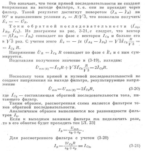 где zф — сопротивление фильтра, измеренное со стороны выходных зажимов mn при разомкнутой цепи на входе фильтра; zР — сопротивление реле. Реле, питающиеся через фильтр обратной последовательности (фильтр-реле), действуют только при несимметричных к. з., когда токи к. з. содержат составляющую обратной последовательности и не реагируют на симметричную нагрузку и трехфазные к. з., поскольку в этих случаях I 2 = 0. Ток небаланса. За счет неточного подбора сопротивлений фильтра может появиться ток небаланса I нб при отсутствии тока I 2, который ограничивает чувствительность фильтр-реле. Поэтому I нб должен сводиться к минимальному значению регулировкой сопротивлений. Баланс сопротивлений может нарушиться при изменении частоты в сети, питающей фильтр, из-за того, что реактивные сопротивления xL, хс зависят от частоты. Это свойство фильтров является их недостатком. Чувствительность ф и л ь т р а-р е л е зависит от чувствительности реле и мощности, отдаваемой фильтром. Каждый источник питания отдает наибольшую мощность приемнику в случае равенства по величине их полных сопротивлений, т. е. при zр = zф. Абсолютный максимум отдаваемой мощности имеет место, если при равенстве полных сопротивлений источника и приемника их реактивные сопротивления также равны, но имеют противоположные знаки [Л. 23]. Следовательно, для обеспечения максимальной отдачи мощности фильтром необходимо выполнить условие rp= rф и хр = - хф (3-22) В качестве реле, питающихся от фильтра, обычно применяются чувствительные электромагнитные токовые реле или поляризованные реле постоянного тока, которые подключаются к фильтру через выпрямитель. в) Фильтры токов прямой последовательности Учитывая, что токи прямой последовательности отличаются от обратной только чередованием фаз, любой фильтр обратной последовательности можно превратить в фильтр прямой последовательности, изменив на его зажимах последовательность подводимых фаз. Например, если на фильтре, изображенном на рис. 3-21, а, поменять местами фазы В и С, т. е. подключить фазу С к зажиму 2, а фазу В — к зажиму 3, то на выходных зажимах фильтра появится напряжение Umn, пропорциональное токам прямой последовательности, а токи обратной последовательности не будут давать напряжения на выходе фильтра. Фильтры токов прямой последовательности в чистом виде используются редко и применяются как правило, в комбинации с другими составляющими ( ГЛАВА ЧЕТВЕРТАЯ