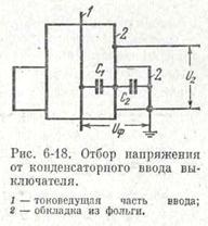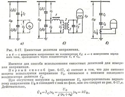Для питания устройства релейной защиты наряду с трансформаторами напряжения могут также применяться емкостные делители напряжения. Емкостные делители состоят из нескольких последовательно соединенных конденсаторов, включаемых между проводом фазы и землей (рис. 6-17).