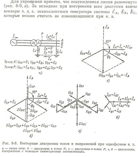 Из диаграммы 8-9, б следует, что ток Iок опережает напряжение UОК на 90°. Векторная диаграмма однофазного к. з. в точке Р, удаленной от места к. з., отличается от предыдущего случая величиной Uа